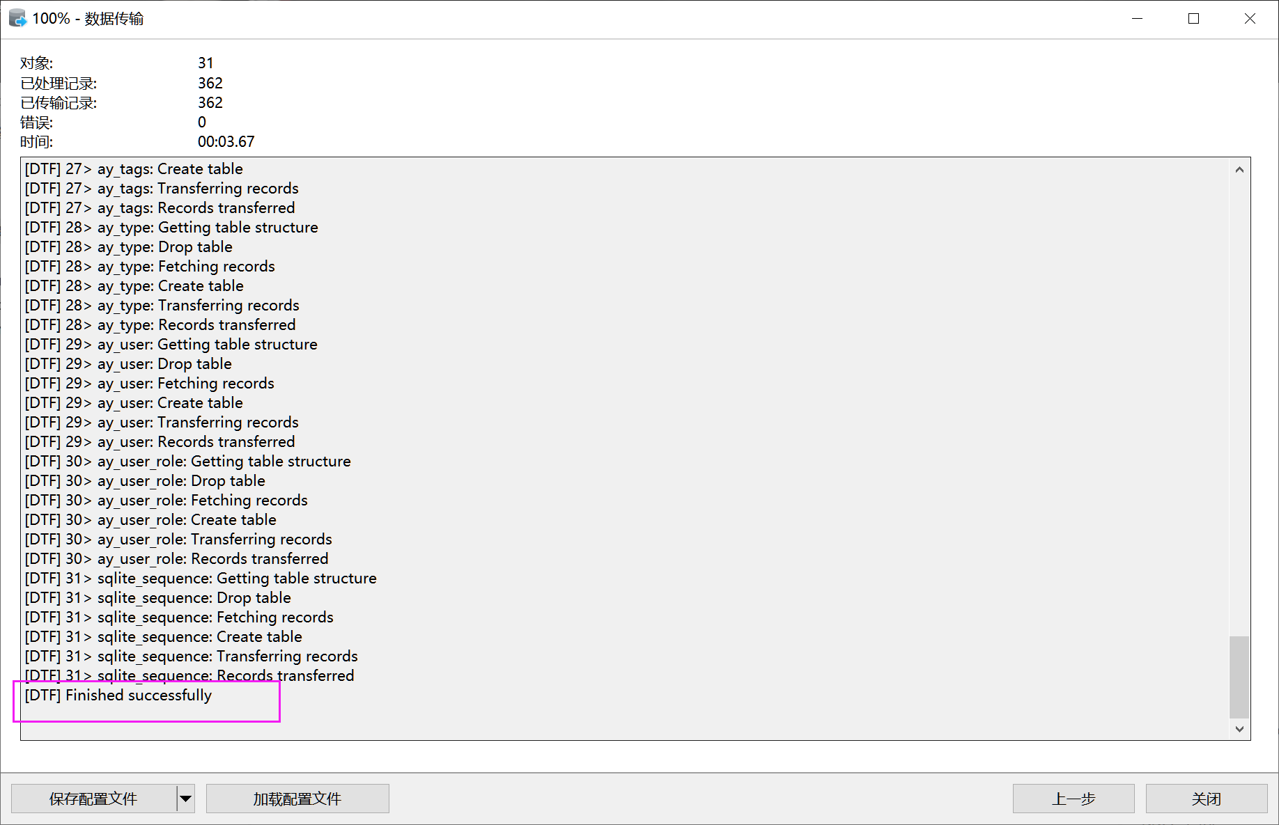 4,勾選左邊的全部表,再點(diǎn)右下角的開始就開始轉(zhuǎn)換了,下方出現(xiàn)Finished successfully即大功告成