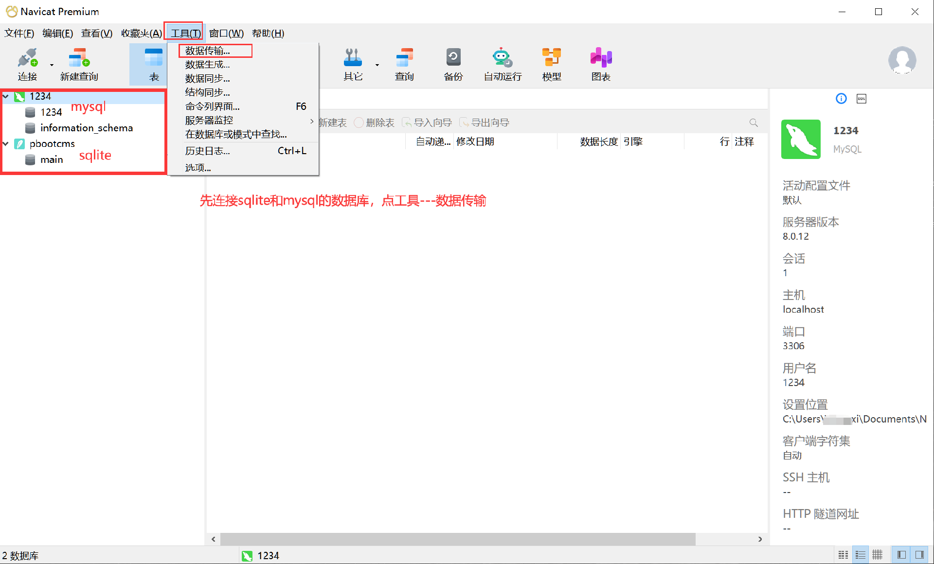 2,連接sqlite和mysql數(shù)據(jù)庫,點(diǎn)工具---數(shù)據(jù)傳輸(mysql可以是服務(wù)器上的,也可以是本地環(huán)境創(chuàng)建的)