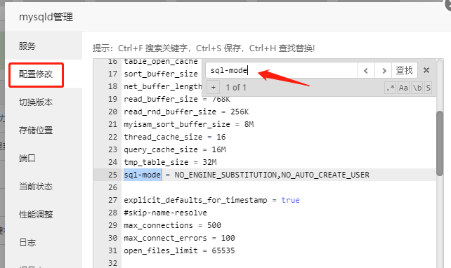 2.點擊配置修改,查找sql-mode或sql_mode (可使用Ctrl+F快捷查找)